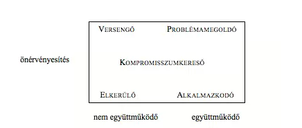 Az önérvényesítésre való törekvés és az együttműködésre való képesség különböző mértékben való jelenléte határozza meg a konfliktuskezelésben tanúsított viselkedésünket. Az alábbi ábrán ennek a két paraméternek a különböző kombinációja jól megmutatja, hogy az emberek milyen viselkedésmódokat követve, mennyire fognak tudni hatékonyan megoldani, feloldani vitás helyzeteket.